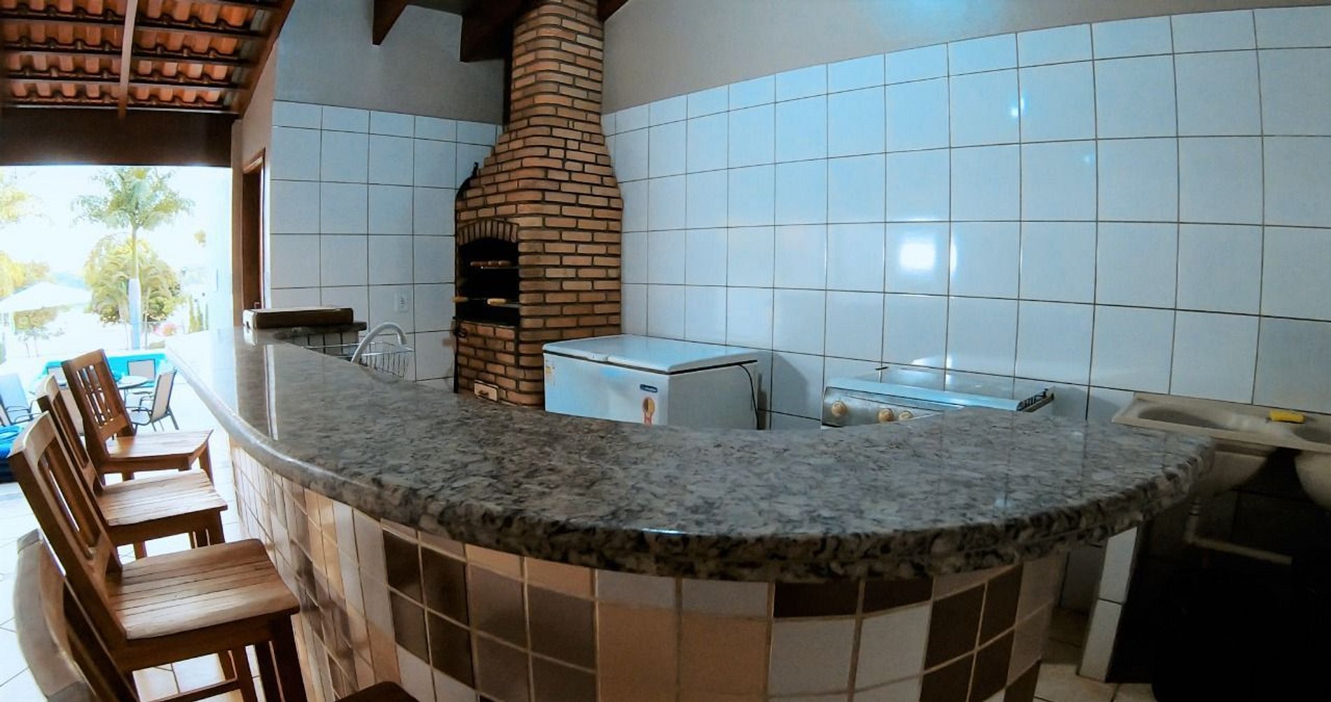 A área externa é totalmente integrada ao lazer, oferecendo piscina ionizada (sem cloro), piscina aquecida e piscina oficial de Biribol, todas disponíveis para uso livre. A área gourmet conta com churrasqueira tradicional, churrasqueira varal para costela de chão, cervejeira, freezer e geladeira, permitindo preparar refeições com praticidade durante toda a hospedagem.